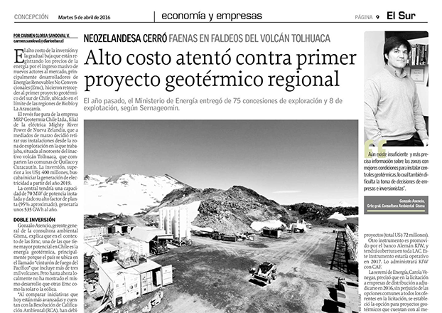 El alto costo de la inversión y la gradual baja que están registrando los precios de la energía por el ingreso masivo de nuevos actores al mercado, principalmente desarrolladores de Energías Renovables No Convencionales (Ernc), hicieron retroceder al primer proyecto geotérmico del sur de Chile, ubicado en el límite de las regiones de Biobío y La Araucanía. El revés fue para de la empresa MRP Geotermia Chile Ltda., filial de la eléctrica Mighty River Power de Nueva Zelandia, que a mediados de marzo decidió retirar sus instalaciones desde la zona de exploración en la que trabajaba, situada al noroeste del inactivo volcán Tolhuaca, que comparten las comunas de Quilaco y Curacautín. La inversión, superior a los US$ 400 millones, buscaba iniciar la generación de electricidad a partir del año 2019. La central tendría una capacidad de 70 MW de potencia instalada y dado su alto factor de planta (95% aproximado), generaría unos 535 GWh al año.