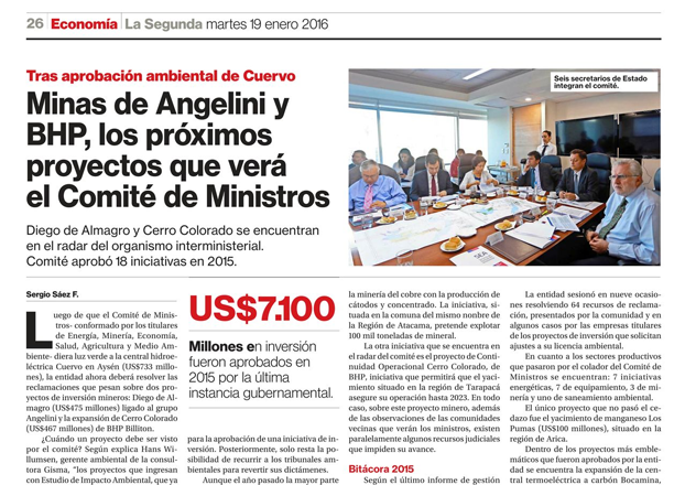 Sergio Sáez F., La Segunda.- Luego de que el Comité de Ministros –conformado por los titulares de Energía, Minería, Economía, Salud, Agricultura y Medio Ambiente- diera luz verde a la central hidroeléctrica Cuervo en Aysén (US$ 733 millones), la entidad ahora deberá resolver las reclamaciones que pesan sobre dos proyectos de inversión mineros: Diego de Almagro (US$ 475 millones), ligado al grupo Angelini y la expansión de Cerro Colorado (US$ 467 millones) de BHP Billiton.