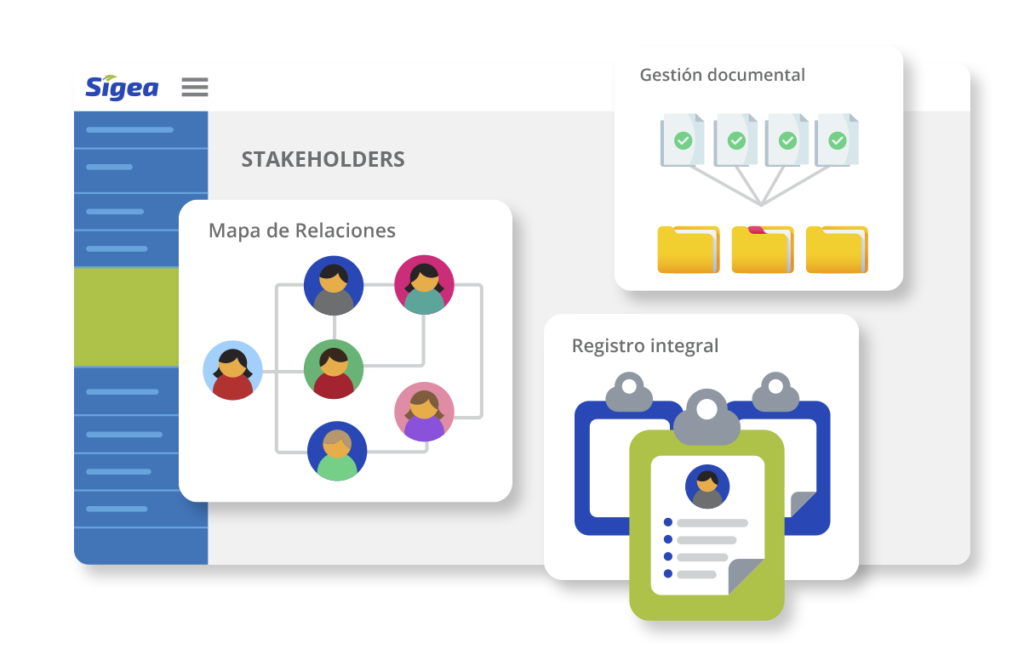 El módulo de SIGEA para la gestión de stakeholders proporciona una solución integral para mapear, gestionar y comprender las relaciones con las partes interesadas. Desde la gestión documental hasta la reportabilidad visual, esta herramienta respalda una gestión estratégica y efectiva de las relaciones con stakeholders. A continuación, se destacan las características claves del módulo.